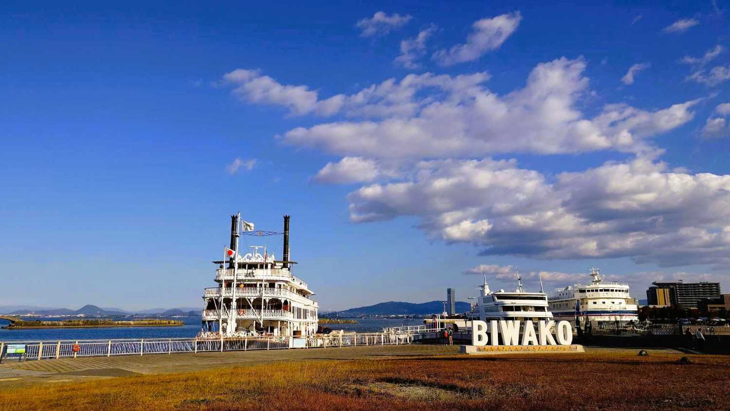 ゴールの大津港に着いた後は、ベンチでコーヒーを飲みながら、湖と紅葉に染まった山々をぼんやり眺めてひと休み、遠くに見える白山の頂上は、もう白くなっていました。